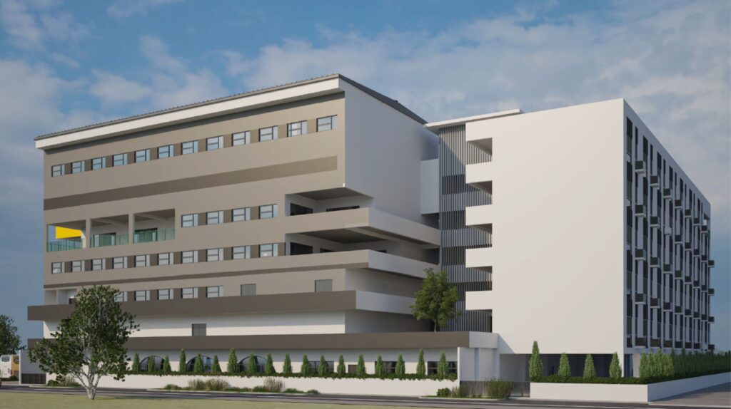 – A light-toned multi-storey structure featuring wide balconies and a clean, modern layout.
