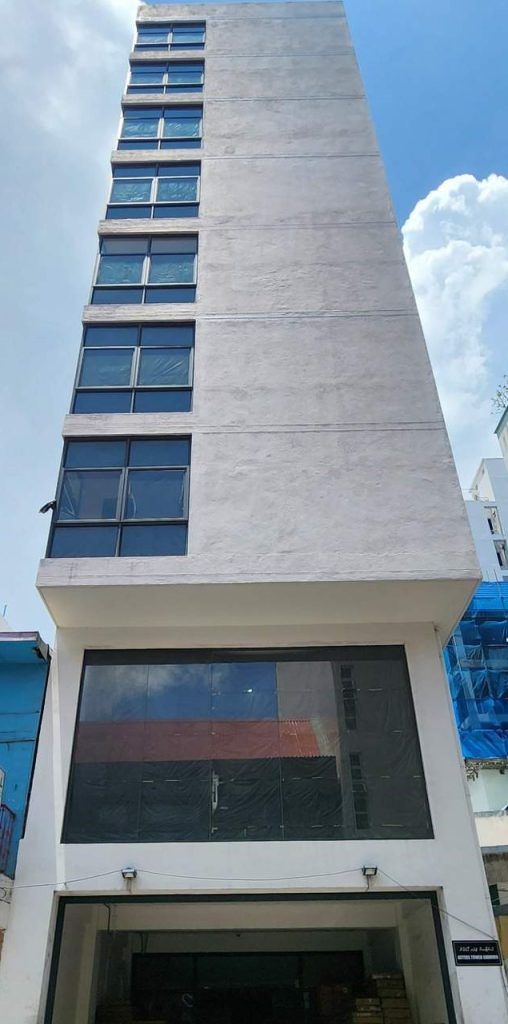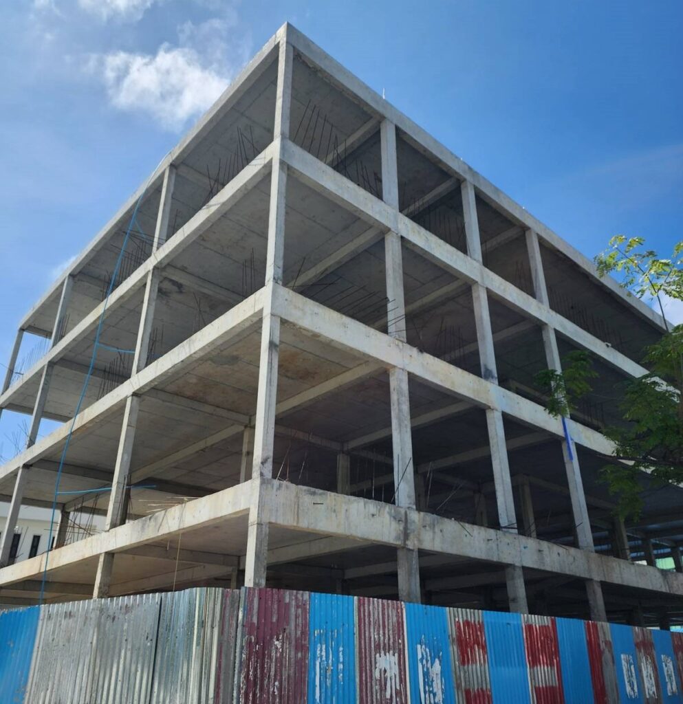 – A bare concrete building frame showing structural columns and slabs, indicating early-stage development.