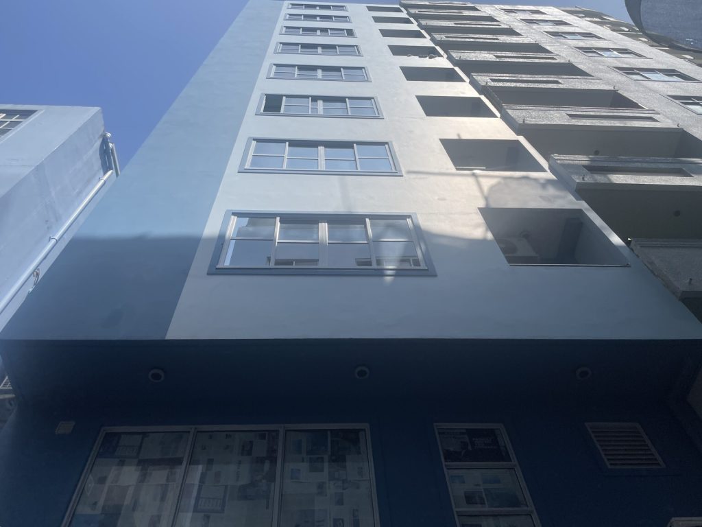 – A tall finished residential tower with a light blue exterior and multiple balconies.
