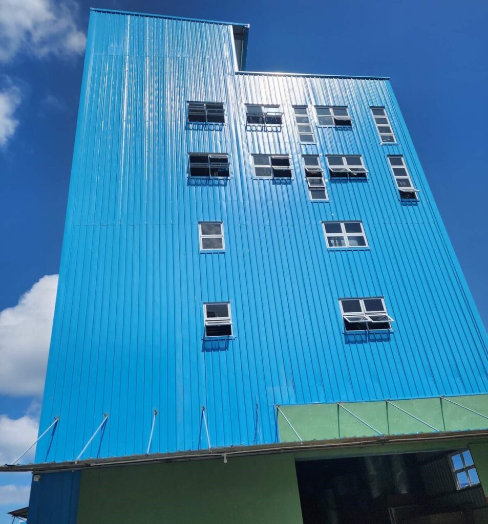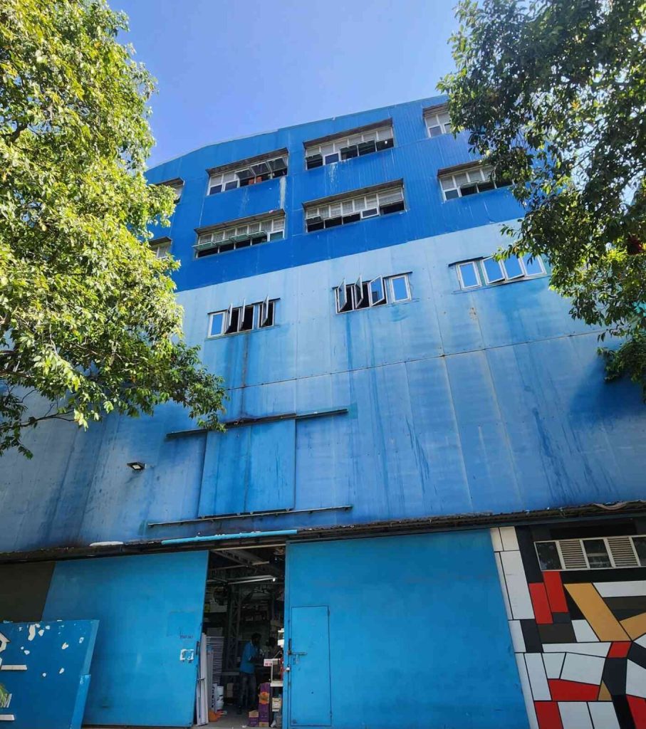 – A blue-clad building with a weathered appearance and shaded areas from surrounding trees.