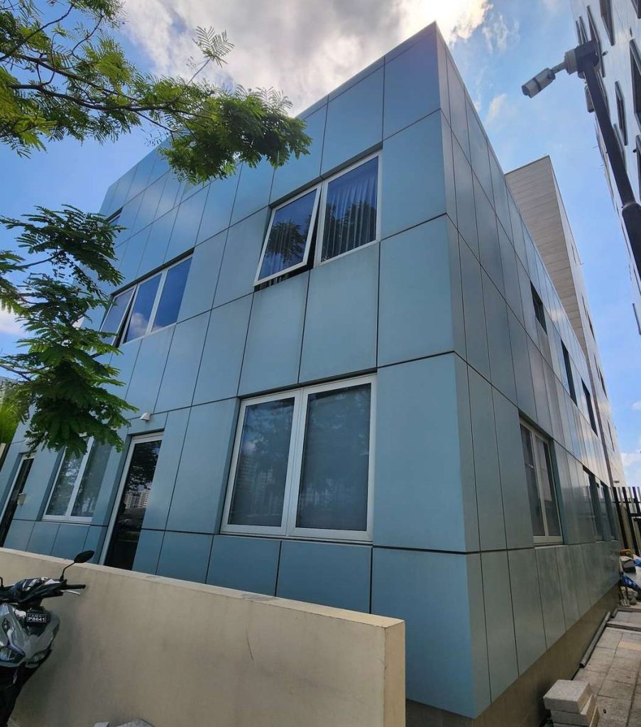 – A cube-like building with a soft blue exterior and large grid-style windows.