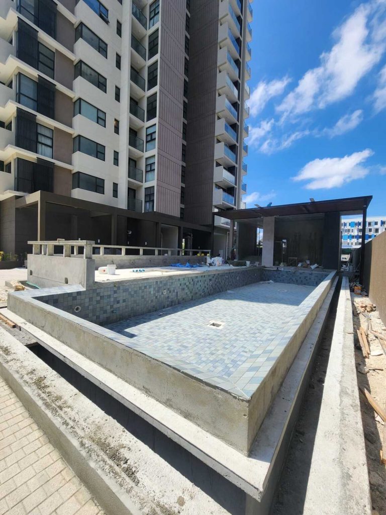 – A modern residential building with a clean, minimalist design and an empty pool area in the foreground, indicating recent completion.