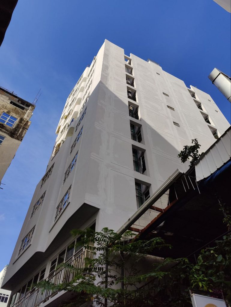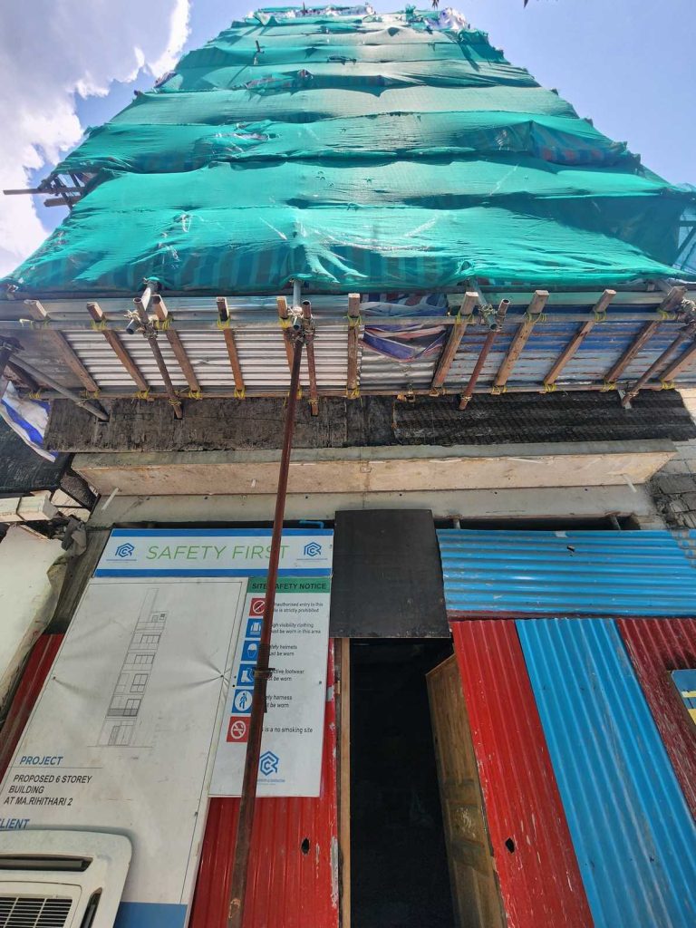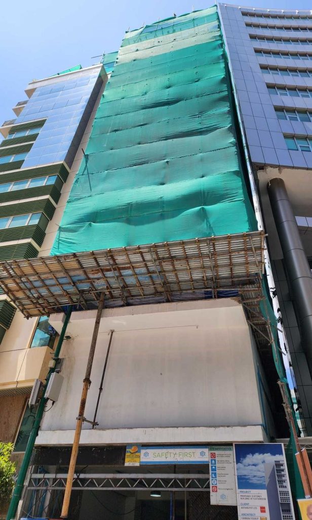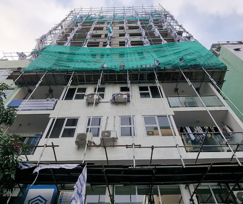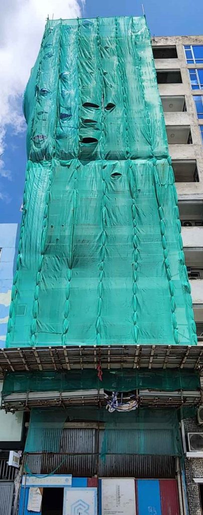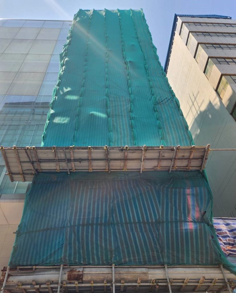– Another project with full-height green construction mesh partially removed, showing wall finishing in progress.