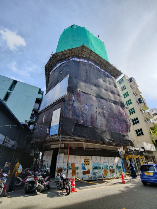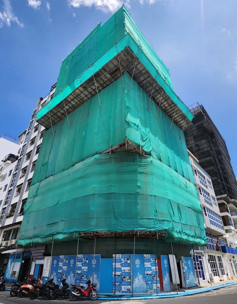 – A mid-rise building still undergoing exterior construction, with scaffolding and safety nets in place.