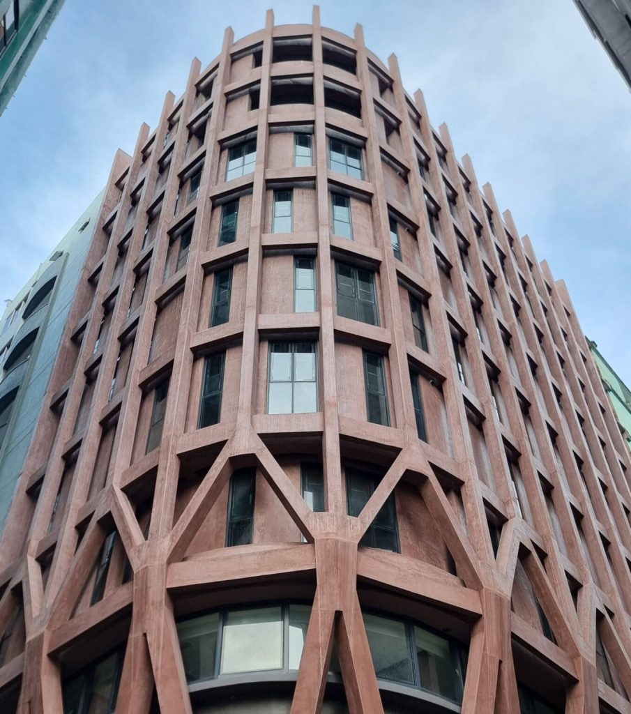 – A striking building with a warm-toned, textured façade and uniquely patterned window arrangements.