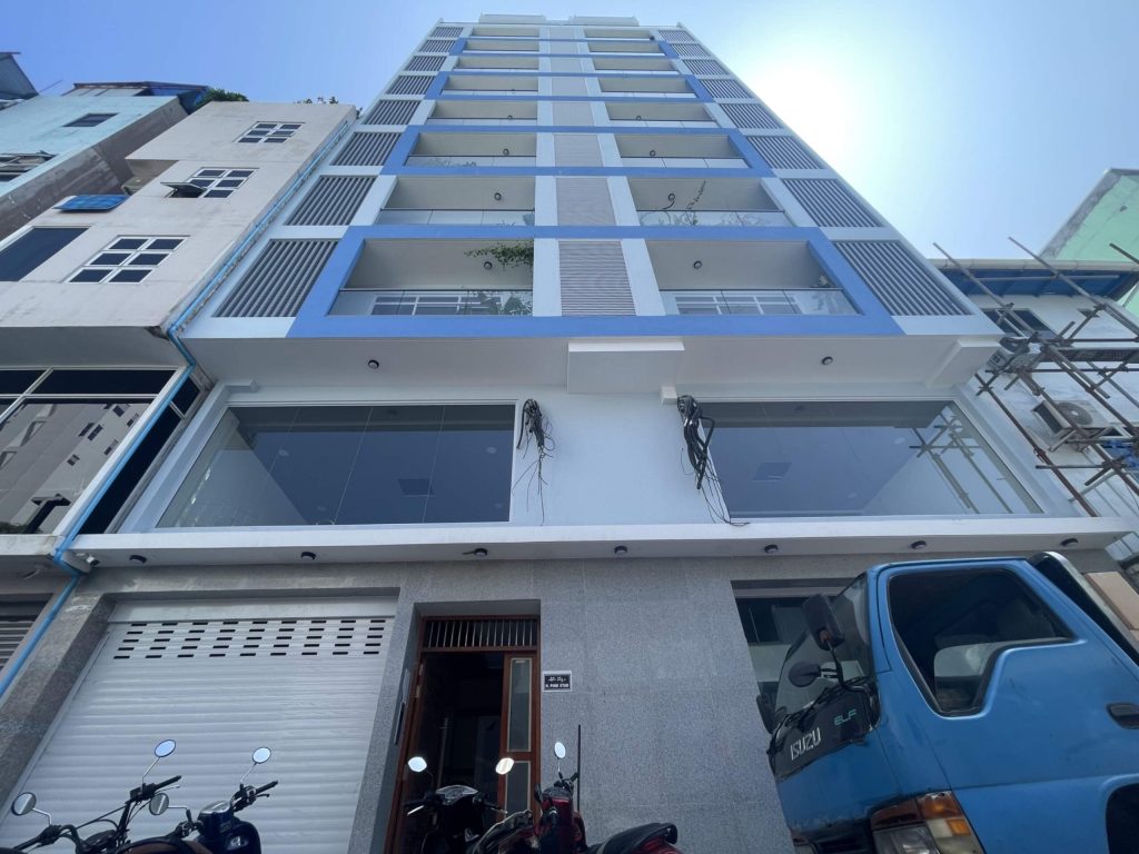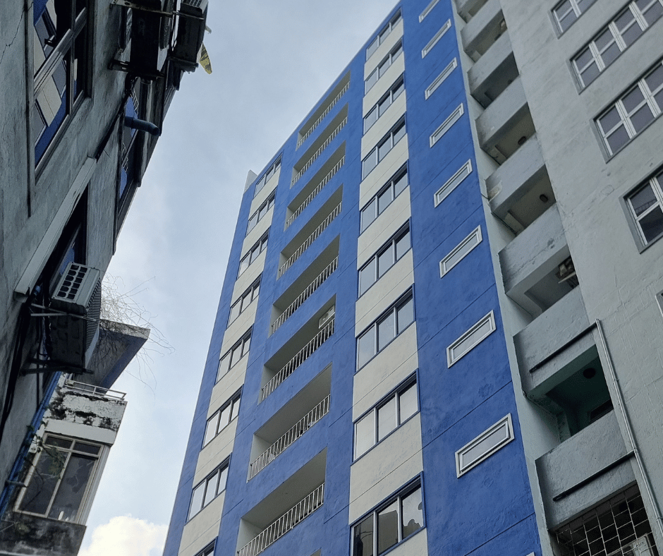 – A finished multi-storey apartment building with blue accents and modern window panels.