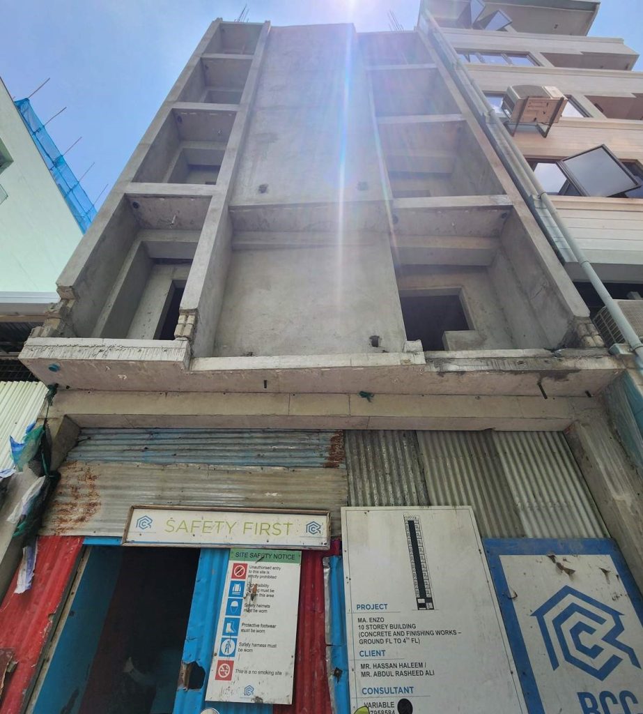 – A building in its final construction phase, with exposed structural elements and ongoing exterior work