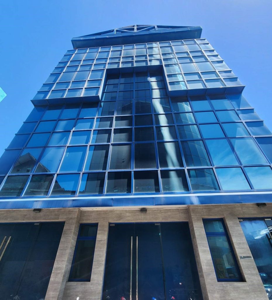 A sleek high-rise featuring a modern blue-glass façade, designed to maximize natural light and create a bold architectural presence.