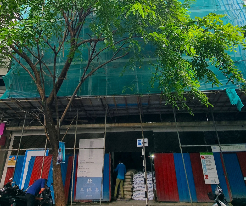 – A completed mid-rise building with construction mesh still visible on the façade, shaded by roadside trees.
