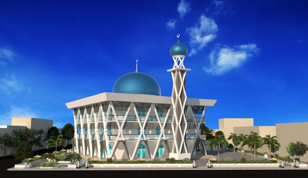 – A large mosque under active construction, covered with scaffolding and turquoise safety netting.