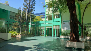 -A community-oriented educational facility surrounded by greenery, offering a welcoming and open environment.